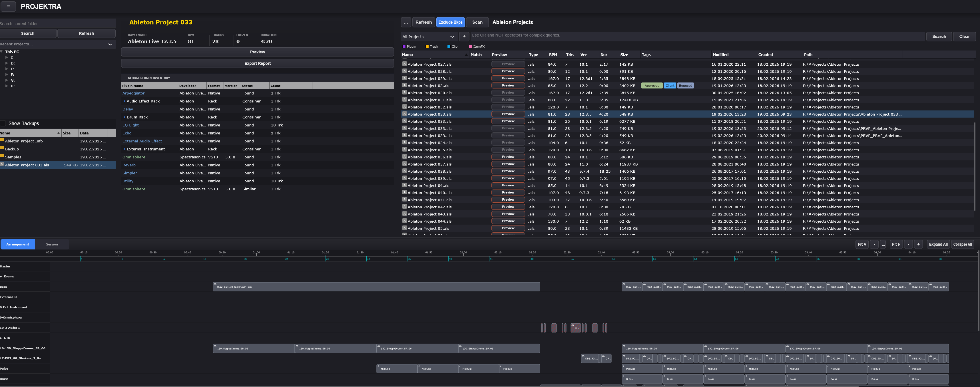 Projektra is an automated DAW project scanning and reporting tool. It parses your DAW project files directly, visualizes track and timeline structure, and generates detailed HTML reports. It also cross-references referenced plugins against your local plugin database.