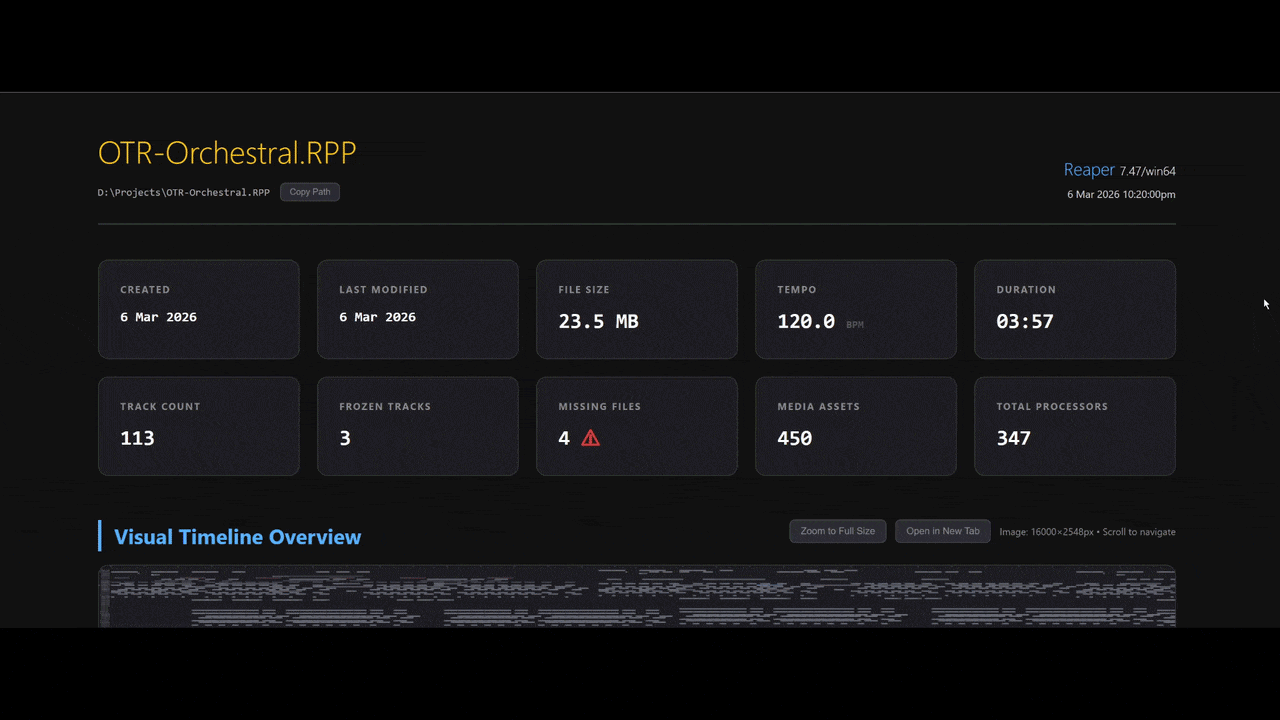 Projektra introduces a professional standard for session documentation. The generated HTML reports are fully encapsulated, self-contained artifacts: all CSS, logic, and visual timeline snapshots are embedded into a single file. This creates a permanent, DAW-independent technical passport of your work. Your project’s structure, plugin inventory, and media requirements remain readable and reproducible in any browser.