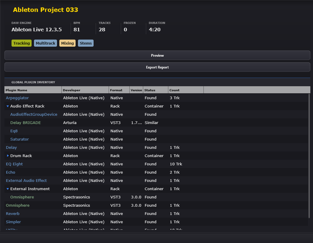 DAW-Specific Meta-Data: Full support for Reaper JS effects, Ableton AMXD (Max for Live), and native internal devices with status mapping (Found, Missing, Native).