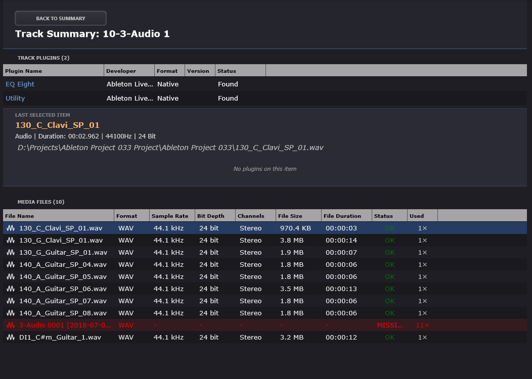 The report contains structured tables for plugin inventory and project structure. Hierarchical elements such as rack-like nested devices and per-asset path lists are shown with collapsible sections so large projects remain readable. Missing items are highlighted to help you spot issues quickly.