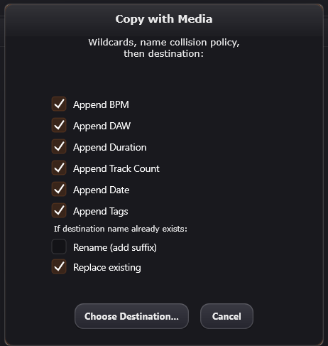 Transform search results into action through a robust batch-processing engine. Utilize dynamic wildcards—including your custom tags, BPM, and DAW type—to automate file renaming and directory organization. The Media-Aware Export module allows you to consolidate sessions into isolated, portable folders, ensuring that every referenced asset is collected and structured for seamless migration or delivery.